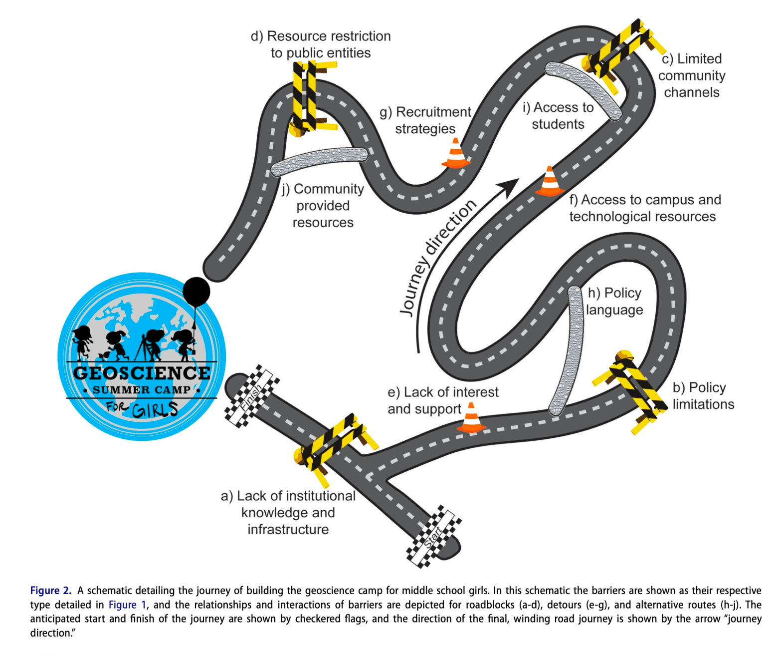 Abstract: “This article reviews our shared experience as two minoritized graduate students, encapsulating what the barriers we encountered were, and identifies the impacts of a personal disinterest by geoscientists and institutional disinvestment in diversity, equity, and inclusion (DEI) issues in the geosciences. Specifically, in this article we advance the concept of disinvestment in the academy, and how disinvestment and disinterest reveal themselves in the ways the geosciences as a field interact with service and outreach to impact the abilities of minoritized geoscientists to create and sustain diversity, equity, and inclusion efforts. Through evaluating the case of our creation of a geosciences camp for problems with disinvestment and disinterest by the academy, we identify barriers we faced and solutions created to address them through the framework of navigating a road, and typologizing them as roadblocks, detours, and alternate routes. The multiple barriers we experienced cumulatively amount to considerable time and effort lost, resulting in harm against us and our careers. We find the disinterest and disinvestment we experienced disincentivizes service and outreach work that is pivotal in improving DEI in geosciences. Our current systems and expectations need modification so we can move away from disinvestment and create engaged support structures.”